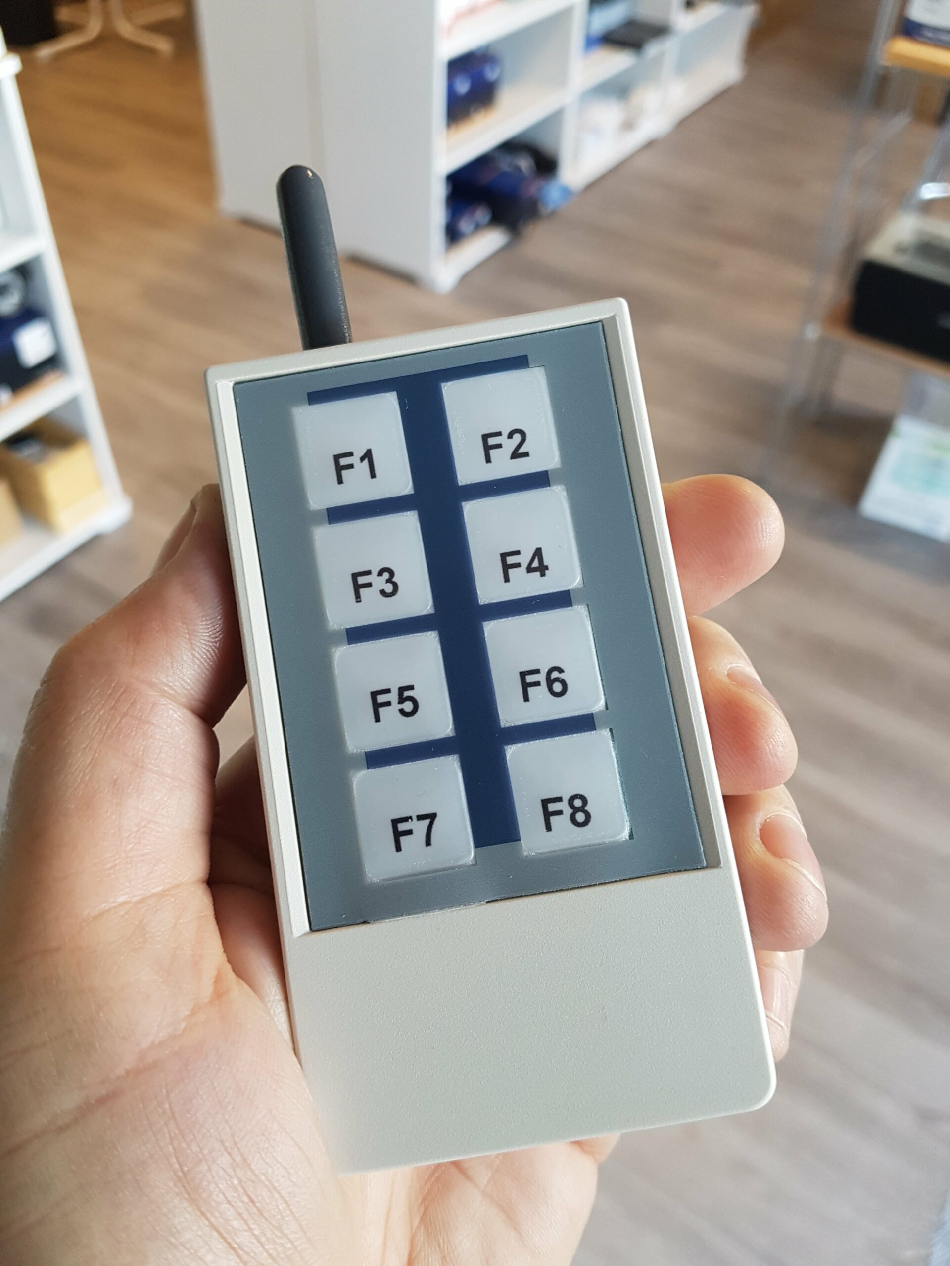 8-fach Rufsender um 8 verschiedene Personen oder auch Gruppen zu senden. Taste 1: Nachschub, Taste 2: Störung an Maschine 2, Taste 3: Störung an Maschine 3 usw… beliebig kombinierbar.